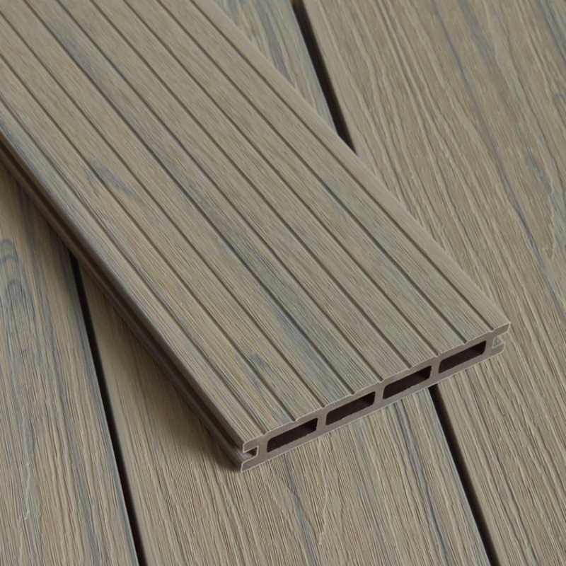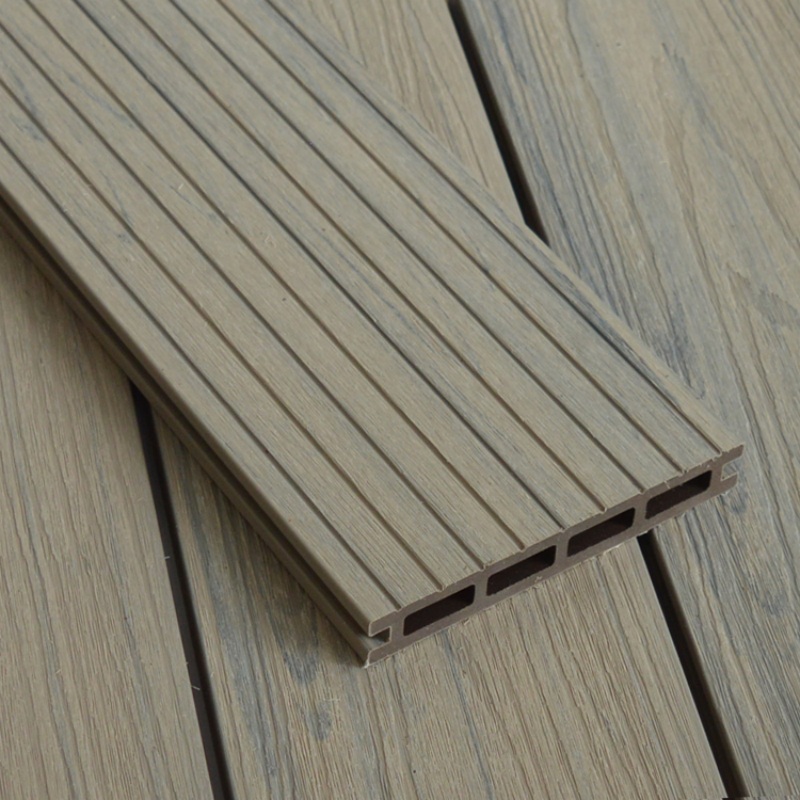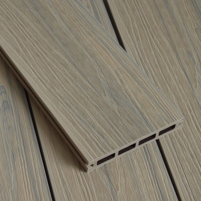 Антикварная древесно-полимерная композитная террасная доска с квадратными отверстиями, изготовленная методом соэкструзии, по цвету дерева.