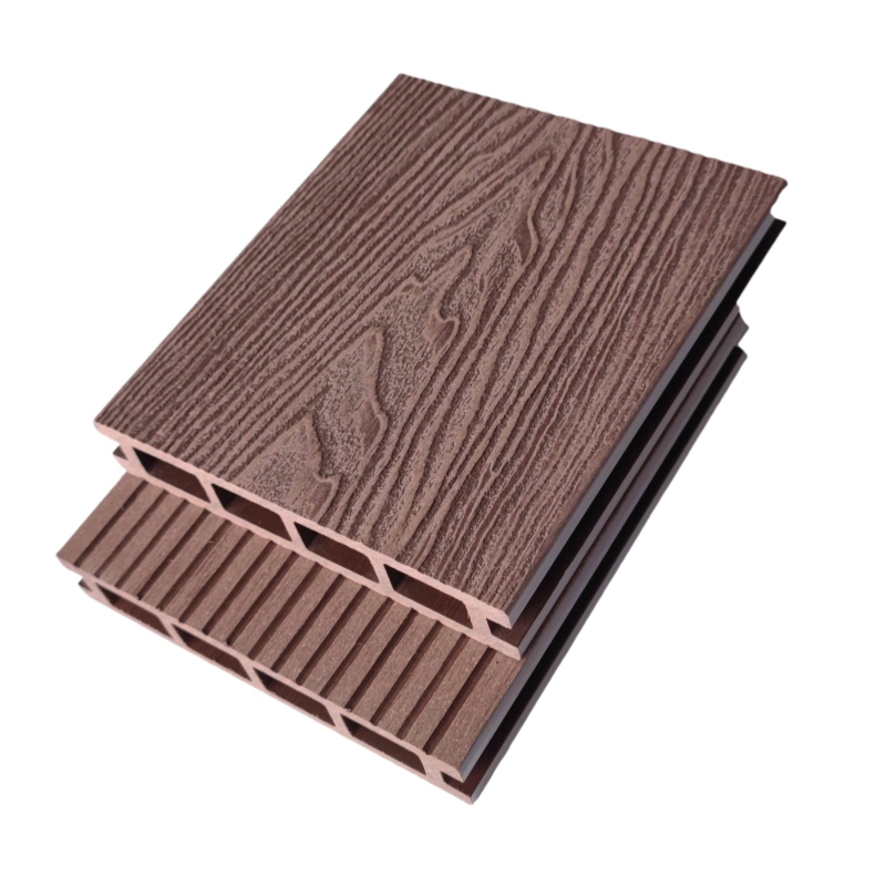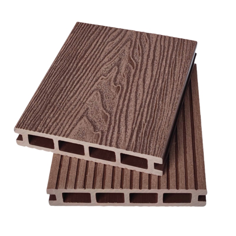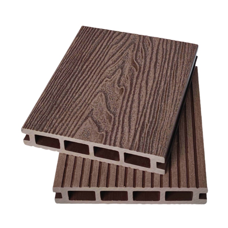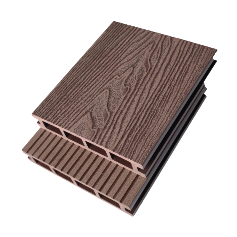 Напольное покрытие из древесно-полимерного композита для сада и патио, коричневого цвета с глубоким рельефом.
